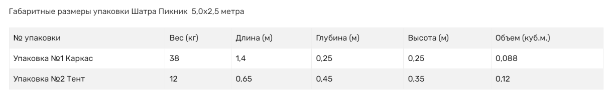 Шатер Пикник 5x2,5 м — отличное решение для коллективного отдыха на природе. Подходит для летней кухни, кафе или беседки. Каркас из стальной трубы диаметр 25 и 28 мм с порошковым покрытием и нижним основанием. Тент из ткани Oxford 300D PU 2000 с водоотталкивающей пропиткой 2000 мм водяного столба, устойчив к солнечным лучам. В комплект входят: каркас, крыша, 6 сплошных стенок и 6 антимоскитных.
